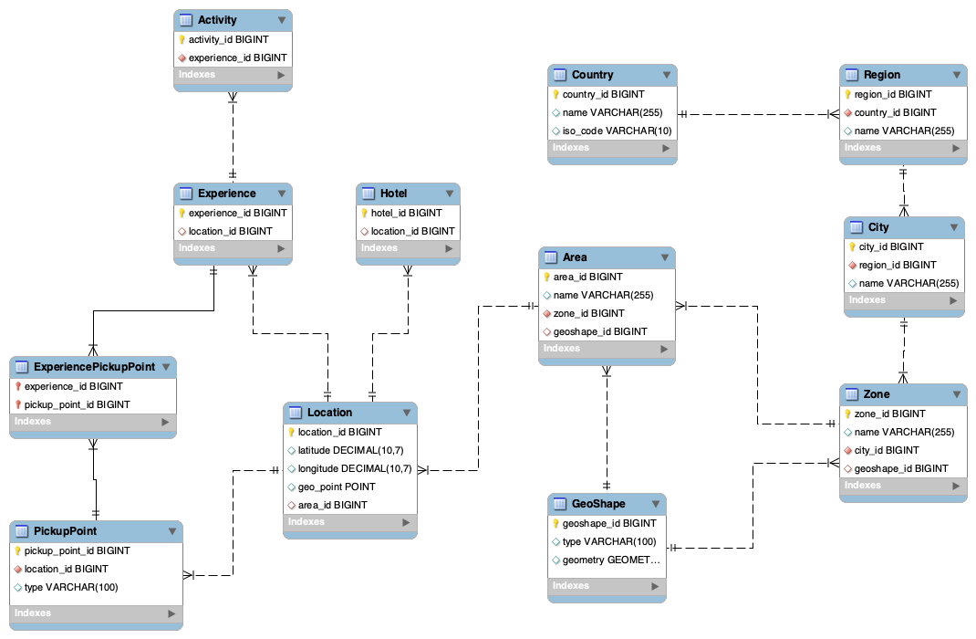 The geolocation layer acts as a shared kernel across multiple bounded contexts (Geolocation, Experience, Hotel, Booking, User, etc), ensuring global consistency without creating cross-domain coupling. By combining hierarchical place identity with geometric precision, the system supports advanced user experiences such as map-based browsing, location-aware recommendations, dynamic pickup routing, and contextual content personalization.